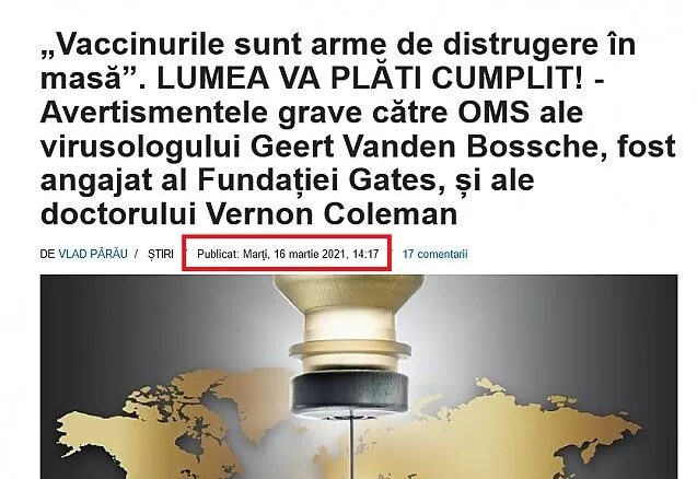 În cazul de față, la care ne referim, este vorba de un Apel științific al doctorului Geert Vanden Bossche, virusolog și expert în vaccinuri, fost angajat al GAVI (inițiativa globală privind vaccinarea) și al Fundației Bill & Melinda Gates, care a tras un semnal de alarmă împotriva injectării heirupiste a populației cu vaccinuri Covid neviabile, considerând că acestea, pe termen lung, vor duce la înmulțirea mutațiilor virusului. Studiul lui Bossche, care de felul lui este pro-vaccinuri, a fost dat publicității pe 15 martie 2021. A doua zi, grație neobositului nostru coleg Vlad Pârău, semnalul era deja publicat de noi și citit de Dvs sub titlul: „Vaccinurile sunt arme de distrugere în masă”. LUMEA VA PLĂTI CUMPLIT! – Avertismentele grave către OMS ale virusologului Geert Vanden Bossche, fost angajat al Fundației Gates, și ale doctorului Vernon Coleman.