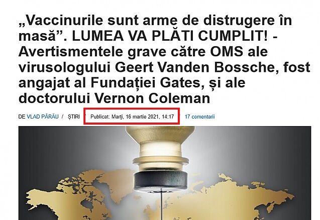 În cazul de față, la care ne referim, este vorba de un Apel științific al doctorului Geert Vanden Bossche, virusolog și expert în vaccinuri, fost angajat al GAVI (inițiativa globală privind vaccinarea) și al Fundației Bill & Melinda Gates, care a tras un semnal de alarmă împotriva injectării heirupiste a populației cu vaccinuri Covid neviabile, considerând că acestea, pe termen lung, vor duce la înmulțirea mutațiilor virusului. Studiul lui Bossche, care de felul lui este pro-vaccinuri, a fost dat publicității pe 15 martie 2021. A doua zi, grație neobositului nostru coleg Vlad Pârău, semnalul era deja publicat de noi și citit de Dvs sub titlul: „Vaccinurile sunt arme de distrugere în masă”. LUMEA VA PLĂTI CUMPLIT! – Avertismentele grave către OMS ale virusologului Geert Vanden Bossche, fost angajat al Fundației Gates, și ale doctorului Vernon Coleman.