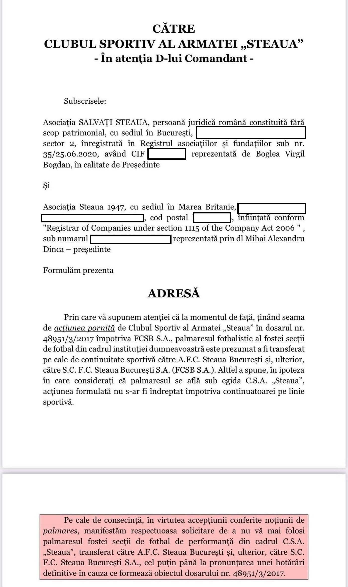 „Pe cale de consecință, în virtutea accepțiunii conferite noțiunii de palmares, manifestăm respectuoasa solicitare de a nu vă mai folosi palmaresul fostei secții de fotbal de performanță din cadrul C.S.A. „Steaua”, transferat către A.F.C. Steaua București și, ulterior, către S.C. F.C. Steaua București S.A., cel puțin până la pronunțarea unei hotărâri definitive în cauza ce formează obiectul dosarului nr. 48951/3/2017”, se arată în unul dintre fragmentele solicitării celor două asociații de suporteri.