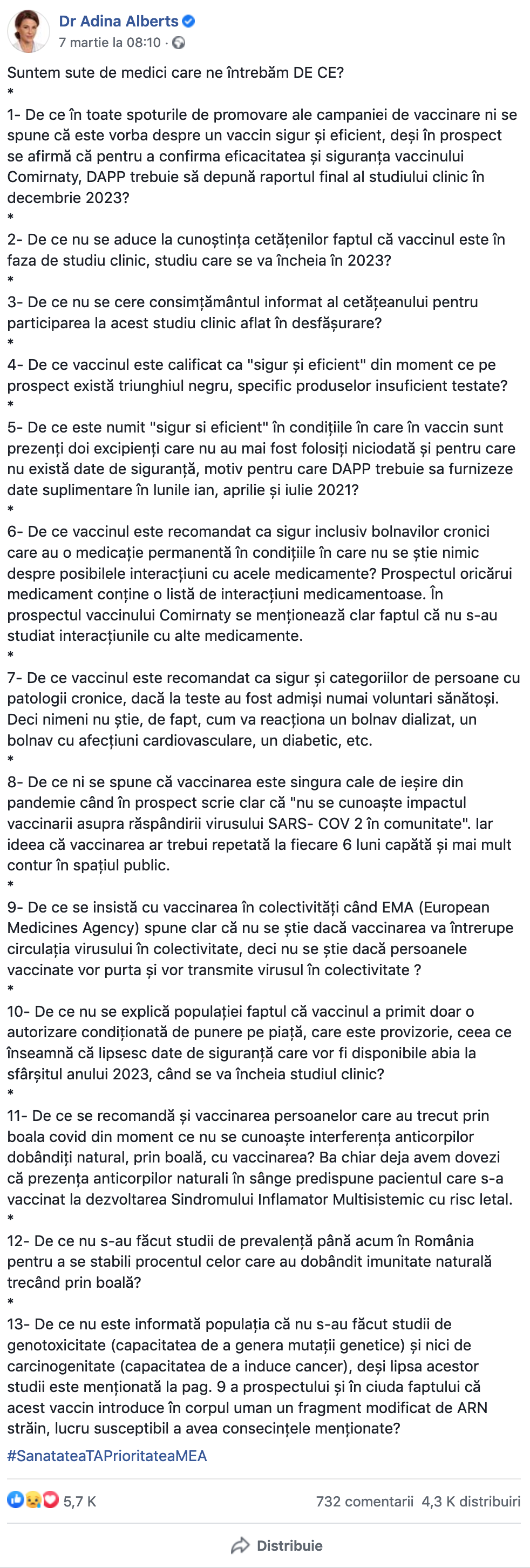 13- De ce nu este informată populația că nu s-au făcut studii de genotoxicitate (capacitatea de a genera mutații genetice) și nici de carcinogenitate (capacitatea de a induce cancer), deși lipsa acestor studii este menționată la pag. 9 a prospectului și în ciuda faptului că acest vaccin introduce în corpul uman un fragment modificat de ARN străin, lucru susceptibil a avea consecințele menționate, scrie Dr. Adina Alberts pe Facebook.