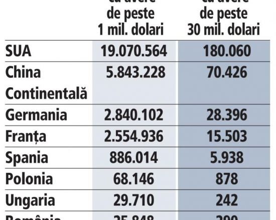 România avea la finalul anului 2020 290 de români cu averi de peste 30 de milioane de dolari, faţă de 212 în 2019: În pandemie, peste 7.600 de români au „sărăcit“ şi au pierdut statutul de milionari în dolari, scrie ZF.