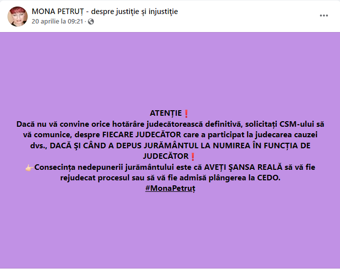 Jurista Mona Petruț a postat un mesaj pe pagina sa oficială, de pe o rețea de socializare, în care afirmă următoarele: