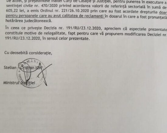 Deși i s-a solicitat un simplu punct de vedere, domnul ministru, de profesie avocat, se substituie autorității judecătorești și apreciază de la sine putere că decizia administrativă emisă de angajatorul Curtea de Apel Timișoara pentru stabilirea drepturilor salariale este nelegală, deși s-a emis cu luarea în considerare a deciziilor Curții Constituționale și Înaltei Curți de Casație și Justiție. Totodată, ministrul stabilește și modul de aplicare al titlului executoriu pe care o parte a personalului îl deține, sentință definitivă care recunoaște modul de calcul corect al salariilor.